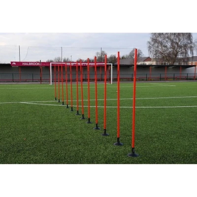 Foot Store Ensemble de 12Poteaux de 7 m de haut avec piquets au sol.Les poteaux peuvent également être utilisés avec une base (non incluse/vendue séparément)Aide à développer la maniabilité latérale.Diamètre des poteaux : 11/4"Fourni avec un sac.