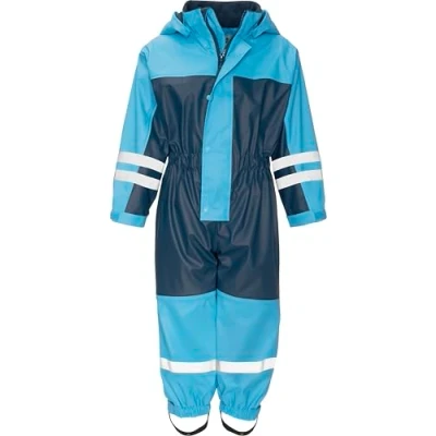 Combinaison de pluie une pièce doublée bleue de Playshoes Cette combinaison de pluie une pièce pour enfant de Playshoes, doublée en polaire, aux couleurs bleu clair / bleu foncé, se compose d'un seul élément. La combinaison est munie d'une capuche amovible et se ferme par une fermeture éclair avec protège-menton et une patte de boutonnage supplémentaire. Des bandes réfléchissantes sont présentes sur le pantalon, les manches et la capuche pour assurer une bonne visibilité de votre enfant dans l'obscurité. Colonne d'eau : 5 000 mm Tous les vêtements Playshoes sont certifiés selon la norme OEKO-TEX® Standard 100 - Classe 1 (Certificat 12.0.05235).