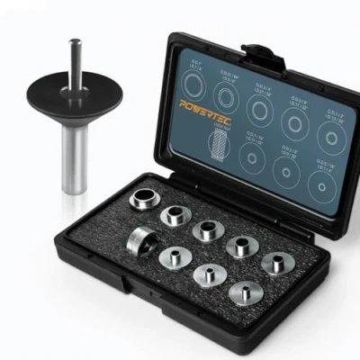 INCLUDES: 10-Piece Router Template Guide Bushing Set with (8) guide bushings, (2) lock nuts and a carrying case, (1) Centering pin with 1/4” & 1/2" ends | (1) Cone GUIDE SIZES for Router Template Bushing Guides Sets: 5/16", 3/8", 7/16", 1/2", 5/8", 51/64", 3/4" and 1" bushings (handles general routing applications, hinge butt routing, and come with dovetail support) PRIMARY FUNCTION for Router Template Bushing Guides Sets: Offers a convenient assortment of router bushings designed to accommodate a variety of popular routing applications COMPATIBILITY for Router Template Bushing Guides Sets: Fits Porter Cable style router sub bases with 1-3/16” diameter center hole - including popular models from Craftsman, DeWalt, Bosch, Milwaukee and more. Specific adapters may be required to fit other models. Refer to your router instructions for details. CONVENIENT STORAGE for Router Template Bushing Guides Sets: Equipped with a plastic, rugged blown molded case with an ergonomic design featuring a cushioned form-fitting foam interior designed to accommodate each solid zinc plated component for easy storage and safe transportation PURPOSE for Router Base Plate Centering Pin and Cone Set: Provides high precision when calibrating plates or the bushing center hole from ¼” to ½”, used for changing or adjusting sub bases QUALITY DESIGN for Router Base Plate Centering Pin and Cone Set: Features zinc-plated steel pin, and the router centering cone is made, shaped and molded with premium ABS plastic, making it distinct from less effective plastic injection cones VERSATILE for Router Base Plate Centering Pin and Cone Set: Cone can be mounted on either the ¼” or ½” end of the center pin, and can be fitted from either the inside or outside SPECIFICATIONS for Router Base Plate Centering Pin and Cone Set: Fits the router sub bases with a center hole less than 44mm (1-3/4”) (SEE POWERTEC 71022, 71369, 71381)