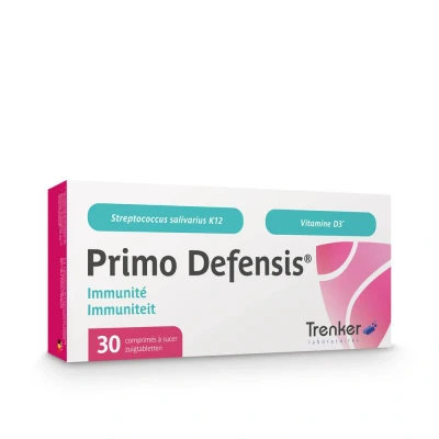 Les compléments alimentaires ne peuvent se substituer à une alimentation variée et équilibrée et à un mode de vie sain.Primo Defensis®Primo Defensis® Trenker contient une espèce spécifique de Streptococcus salivarius, à savoir Streptococcus salivarius K12, initialement isolée de la cavité buccale d'un enfant résistant à la laryngite.Primo Defensis® Trenker colonise naturellement et progressivement le nez, l'oreille et la gorge avec Streptococcus salivarius K12. De cette manière, Primo Defensis® Trenker forme une "première barrière de protection" contre la propagation de bactéries nocives dans le nez, la gorge et les oreilles. Ce & complément alimentaire naturel unique contient de la vitamine D, qui renforce le système immunitaire, et contient la souche bactérienne Streptococcus salivarius K12, dont les études scientifiques ont montré l'efficacité contre les infections du nez, de la gorge et des oreilles. Complément alimentaire contenant de la vitamine D, qui aide à construire une "première barrière protectrice" contre la propagation de bactéries nocives dans le nez, la gorge et les oreilles. La vitamine D contribue au fonctionnement normal du système immunitaireValeurs nutritionnelles: Par jour: Lactobacillus rhamnosus R11 Lactobacillus rhamnosus GG: 1 milliard d'UFC Bifidobacterium longum R175: Lactobacillus helveticus R52: 0,5 milliard UFC Recommandation de consommation :1 comprimé à sucer par jour au coucher après le brossage des dents.Remarque:Ne pas dépasser la quantité journalière recommandée indiquée.Conservation:Conserver au frais (6-25 °C) et à l'abri de la lumière. Tenir hors de portée des enfants.Les quantités nettes : 30 pastilles à sucer90 comprimés à sucerFabricant:TrenkerAvenue Thomas Edison, 32 1402 Thines (Nivelles)Belgique