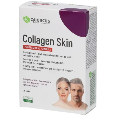 Complément alimentaire à utiliser dans le cadre d'une @@@ouMM2Rp4IzPS6IaMB6OdnaLGf99rPDiu@@@ variée, équilibrée et d'un mode de vie sain.Quercus Collagen Skin est une formule totale qui nourrit la peau de l’intérieur. Ce complexe contient du Naticol®; une forme très pure de collagène marin de type I. Il s’agit d’un mélange de peptides bioactifs courts de collagène, des molécules importantes qui contribuent à la beauté de la peau. En effet, avec les années, la formation de collagène diminue, ce qui entraîne une perte de fermeté et l’apparition de rides. L’adjonction de 1vitamine C (PureWay-C™) soutient la formation normale du collagène pour préserver une peau saine et une apparence plus jeune. ExceptionHYAL® Star contient des chaînes d’acide hyaluronique de différentes longueurs, comme c’est le cas par nature dans la composition de la peau. L’acide hyaluronique est aussi appelé “éponge moléculaire” du fait de ses propriétés hydrophiles qui lui permettent de retenir l’hydratation dans la peau. Ovoderm® est un extrait très pur de membrane de coquille d’œuf par nature riche en collagène, élastine, kératine et acides aminés soufrés. 2ExceptionHYAL® Star et Ovoderm® diminuent la profondeur et la grandeur des rides tout en améliorant la barrière cutanée, la finesse du grain et l’élasticité de la peau. Contient du silicium végétal issu du bambou.Utilisez Quercus Collagen Skin tous les jours pendant au moins 4 semaines pour voir les premiers resultats et pendant 8 semaines pour un resultat optimal. Ce complexe contribue a la synthese normale du collagene pour preserver ainsi la sante des cheveux, des ongles, des os, des articulations et des cartilages grace a la presence de vitamine C.Composition:Hydrolysat de collagène (poisson) (83,3%) , acide L-ascorbique , membrane de coquille d’oeuf (5%) , hyaluronate de sodium , poudre de bambou (Bambusa arundinacea) , antiagglomérant: acides gras , bioflavonoïdes citriques.Valeur nutritionnelle: Pour 2 sticksAJR*Collagène (Naticol®)5000 mg Acide hyaluronique (ExceptionHYAL® Star)200 mg Membrane coquille d'œuf (Ovoderm® (Membrane Egg Technology))300 mg Vitamine C (PureWay-C™) 250 mg313%Bambusa arundinaceae extr. (75% silica)167 mg *Apport journalier de référenceConseils d'utilisation:2 x 1 stick par jour. Ajoutez le poudre en remuant dans une boisson chaude ou froide (200 ml). Se dissout mieux dans un liquide chaud.Précautions d'emploi:Conserver à l’abri de la chaleur (max. 25°C); de l’humidité et de la lumière.En cas de grossesse ou de l’allaitement; il est recommandé de ne prendre le produit qu’après avoir consulté son médecin.Tenir hors de portée des jeunes enfants. Ne pas dépasser la dose recommandée. Poids net:20 sticksFabricant:KeyPharm LaboratoriesSiemenslaan 118020 OstkampBelgique