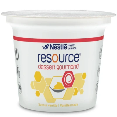 Il est important d'avoir une alimentation variée et équilibrée et un mode de vie sain.Resource Dessert Gourmand est un aliment diététique pour les besoins nutritionnels en cas de dénutrition ou risque de dénutrition. Convient aux patients présentant une dysphagie. Nutritionnellement incomplet, hyperprotéiné et hyperénergétique.Denrée alimentaire destinée à des fins médicales spéciales.Stérilisé Uht. Conditionné sous atmosphère protectrice. Sans gluten.Composition :Eau, sucre, protéines de LAIT, crème de LAIT, sirop de glucose, huile de colza, LAIT écrémé en poudre, épaississants (E1442, E407), emulsifiant (E471), minéraux (citrate de sodium, chlorure de magnésium, citrate de potassium, chlorure de sodium, citrate de magnésium, sulfate de manganèse, iodure de potassium), vitamines (C, E, niacine, acide pantothénique, B6, thiamine, riboflavine, A, acide folique, K, biotine, D), correcteur d'acidité (E525), arômes, colorant (bêta-carotène). Sans gluten.Valeur nutritionnelle : Par 100 gPar 125 gÉnergie630 kJ / 150 kcal788 kJ / 188 kcalLipidesdont :acides gras saturésacide gras mono-insaturésacides gras poly-insaturés5,0 g1,5 g2,1 g0,90 g6,2 g1,9 g2,6 g1,1 gGlucidesdont :sucreslactose17 g14 g2,0 g22 g17 g2,5 gFibres0 g0 gProtéines9,0 g11 gSel0,13 g0,16 gP:L:G:F24:30:46:0 % kcal Conseils d'utilisation :Utilisation et conservation : A consommer de préférence frais. Non ouvert, conserver dans un endroit sec et frais. Après ouverture, recouvrir, conserver au réfrigérateur et consommer dans les 24 heures.Dosage recommandé : 1 à 3 unités par jour en complément de l'alimentation ou selon prescription médicale.Précautions d'emploi :Utiliser sous contrôle médical. Ne peut être utilisé comme seule source de nutrition. Convient dès l’âge de 3 ans.Poids net :500 g (4 x 125 g)Fabricant :Nestlé Health Science Belgilux221, rue de Birmingham1070 BruxellesBelgique
