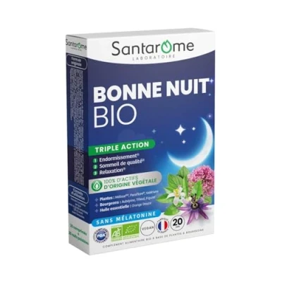 E.LeclercSantarome Bonne Nuit Bio 20 Comprimés est un complément alimentaire à la triple action pour favoriser l'endormissement, un sommeil de qualité et la relaxation. La mélisse aide à l'endormissement et à une relaxation optimale. La passiflore contribue à un sommeil de qualité. La valériane et l'huile essentielle d'orange douce complètent la formule. La formule contient également un trio de bourgeons d'aubépine, de tilleul, de figuier. Frais, sauvages et récoltés à la main, ils concentrent l'ensemble des actifs de la plante. Sans accoutumance, sans dépendance, sans somnolence. Certifié Agriculture Biologique. Contrôle FR-BIO-01. Vegan. Fabriqué en France.