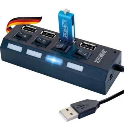 PixmaniaSchwaiger UH4013. Interface de l'hôte: USB 2.0, Interfaces Hub: USB 2.0. Taux de transfert de données: 480 Mbit/s, Couleur du produit: Noir. Tension d'entrée: 5 V. Largeur: 105 mm, Profondeur: 36 mm, Hauteur: 22 mm