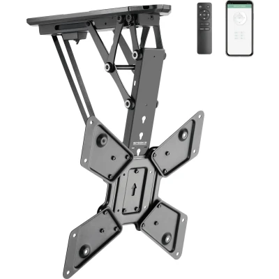 Design rabattable pour un rangement simple et peu encombrant · Compatible Tuya · Prend en charge le pliage et le pliage automatiques · Pour écrans d'un poids maximal de 30 kg · Moteur stable, puissant et durable · Télécommande sans fil incluse · Bluetooth Au plafond, le téléviseur est rangé peu de place et a disparu du champ de vision Le support de plafond SpeaKa Professional SP-TVCM-510 Smart TV Smart TV permet de rabattre facilement les moniteurs jusqu'à 30 kg de poids au format 23 - 55 pouces, en cas de besoin, puis de les remettre en position de rangement Et cela avec une inclinaison jusqu'à 75° et très pratique par télécommande ou via l'application Tuya Le support est conforme à plusieurs normes VESA et un matériel de montage complet est fourni