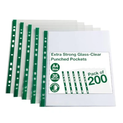 Rangez vos notes et papiers dans ces pochettes perforées légères en polypropylène Le matériau transparent vous permettra de voir facilement ce qu'il y a à l'intérieur, tout en protégeant vos documents La tranche multi-perforée vous permet de classer les poches facilement dans un classeur ou un dossier A4 ; un essentiel pour tout bureau, école, collège ou université 55 microns, lot de 200