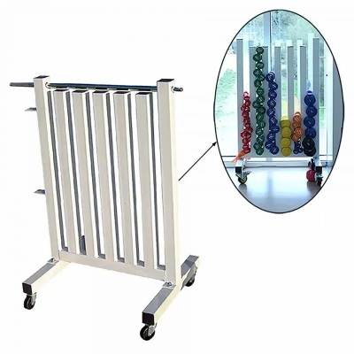Support en métal renforcé. Il dispose de 6 canaux pour stocker les poids en vinyle, de roues pour les déplacer et d'une barre supérieure pour la fermeture. Mesures : largeur 70 cm, hauteur 115 cm et profondeur 50 cm.