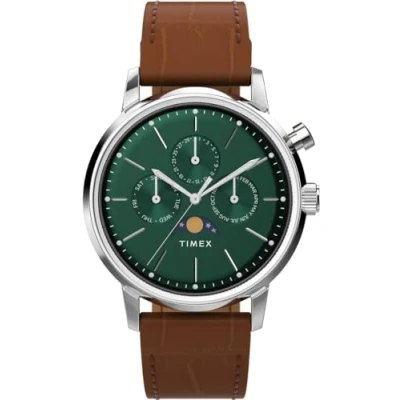 Notre Marlin Moon Phase Multifunction rend hommage aux grands esprits qui ont propulsé l’humanité sur la lune avec un sous-cadran qui reflète fidèlement le cycle lunaire. Cette montre Multi Dial dispose d’une fonction Calendrier : Jour-Date, Phase de Lune et Aiguilles Lumineuses Bracelet de Haute qualité en Cuir Marron 21 cm de longueur et 19 mm de largeur avec une Boucle Ardillon Diamètre du boîtier: 40 mm, Épaisseur du boîtier: 12 mm, Couleur du boîtier: Argent et Couleur du cadran: Vert Résistant à l'eau: 5 bar-Poids: 54 g La montre est livrée dans une belle boîte cadeau avec une garantie de 2 ans