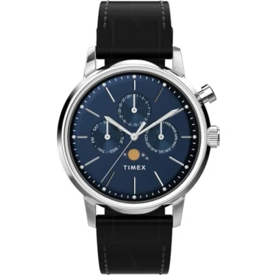 Notre Marlin Moon Phase Multifunction rend hommage aux grands esprits qui ont propulsé l’humanité sur la lune avec un sous-cadran qui reflète fidèlement le cycle lunaire. Cette montre Multi Dial dispose d’une fonction Calendrier : Jour-Date, Phase de Lune et Aiguilles Lumineuses Bracelet de Haute qualité en Cuir Noir 21 cm de longueur et 19 mm de largeur avec une Boucle Ardillon Diamètre du boîtier: 40 mm, Épaisseur du boîtier: 12 mm, Couleur du boîtier: Argent et Couleur du cadran: Bleu Résistant à l'eau: 5 bar-Poids: 54 g La montre est livrée dans une belle boîte cadeau avec une garantie de 2 ans