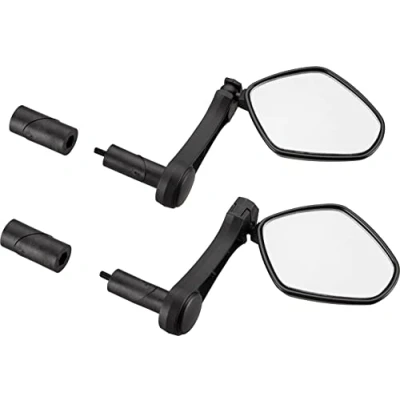 Paire de rétroeurs d'extrémité de guidon Fixation par montage intérieur guidon sur les extrémités du guidon (diamètre guidon 14,5 à 19,5 mm) Réglable avec rotule et rotule Reversible Forme du miroir: convexe pour champ extra large de ion. Dimensions du miroir : 80 mm. Poids : environ 180 g. Matériau : verre miroir, mât : aluminium, boîtier : plastique
