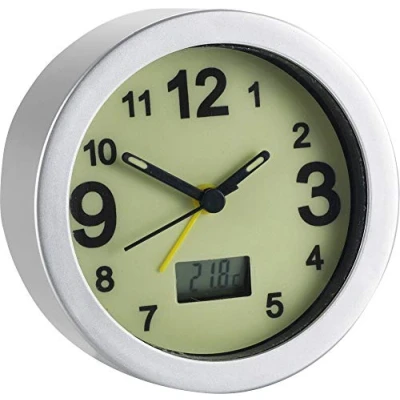 Réveil lumineux pour une visibilité optimale de l'heure même dans l'obscurité Avec cadran fluorescent, aiguilles lumineuses et grands chiffres Réveil élégant dans un joli design argenté Avec affichage numérique de la température ambiante, pratique et maniable, idéal aussi en voyage Dimensions (L x h x l) : 9,5 x 9,5 x 3,8 cm, 1 x pile de type AA nécessaire (non fournie)