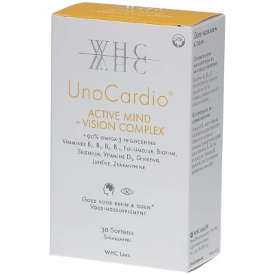 Complément alimentaire à utiliser dans le cadre d’une alimentation variée, équilibrée et d’un mode de vie sain. Ainsi, UnoCardio Active Mind est un complexe exceptionnel qui, grâce à l’EPA et au Dha, soutient la fonction cardiaque normale et préserve la composition sanguine optimale, en assurant notamment une assimilation optimale de fer (vitamine B2) et une formation normale des globules rouges (vitamines B6, B12 et acide folique). De même, votre résistance reçoit tout ce qui est nécessaire pour un fonctionnement optimal (vitamines B6, B12, D3, acide folique et sélénium), alors que la sensation de fatigue diminue, elle aussi (vitamines B2, B3, B6, B12 et acide folique). Mais l’atout principal de UnoCardio Active Mind est que le DHA permet à tout âge et en toute circonstance un fonctionnement optimal de votre cerveau et de vos yeux. Grâce aux vitamines B3, B6, B12, à la biotine et à l’acide folique, votre capacité d’apprentissage et votre mémoire restent en pleine forme. Concentration exceptionnellement élevée de 90% d’oméga-3 545 mg d’huile de poisson oméga-3, avec 300 mg d’EPA et 204 mg de DHA Complexe de vitamines B et d’antioxydants Certifié de la plus haute pureté Issu de la pêche durable, exclusivement d’espèces non menacées Sans gélatine bovine, convient aux pesco-végétariens Sans odeur de poisson Pas de régurgitations Sans gluten, sans lactose Indication: Un complexe idéal pour toute personne qui travaille souvent à l’ordinateur ou qui exerce une fonction exigeant une concentration sans faille. Idéal aussi pour les personnes qui prennent de l’âge, mais qui aiment élargir leurs connaissances et veulent garder un esprit vif. * En cas d’un apport d’au moins 250 mg par jour. Composition: Concentré de TG d’huile de poisson de haute mer (d’anchois; de sardines et de maquereaux), gélatine de poisson, humectant: glycérol, lutéine (FloraGLO®), éleuthérocoque 5:1 extrait de racine (Eleutherococcus senticosus), nicotinamide, agent de charge: dioxyde de silicium, zéaxanthine naturelle (ZeaONE Tm), émulsifiant: lécithine de soja, chlorhydrate de pyridoxine, arome naturel d’orange; riboflavine, antioxydant: TocoMarin (un mélange d’extraits de romarin et de tocophérols), acide (6S)-5-méthyltétrahydrofolique sous forme de sel de glucosamine (Quatrefolic®), cholecalciferol, méthylcobalamine, sélénate de sodium, D-biotine. Valeur nutritionnelle: Pour 1 softgel *AJR Concentré d’huile de poisson de haute mer 600 mg Oméga-3 total (triglyceride, rTG) 545 mg - EPA (acide eicosapentaénoïque) 300 mg - DHA (acide docosahexaénoïque) 204 mg Vitamine B6 6 mg 429% Vitamine B2 2.4 mg 171% Vitamine B3 40 mg 250% Acide folique 400 μg 200% Sélénium 55 μg 100% Biotine 50 μg 100% Vitamine D3 12.5 μg/500 IE 250% Vitamine B12 3 μg 120% Lutéine 10 mg Zéaxanthine 2 mg GinSeng (Eleutherococcus PE 5:1) 50 mg Conseil d'utilisation: 1 softgel par jour, à prendre de préférence avec une alimentation riche en matières grasses comme un yaourt, un aliment à l’huile d’olive ou d’autres lipides. Ne pas dépasser la dose journalière recommandée. Sans gluten / Sans lactose Précautions d'emploi: Conserver au frais (max. 25°C) et au sec, à l’abri de la lumière. Ne pas congeler. Ne pas dépasser la dose quotidienne recommandée. Tenir hors de la portée des enfants. Poids net: 30 softgels Fabricant: WHC Labs SRL. Fruithoflaan 97 bus 26 2600 Berchem Belgique