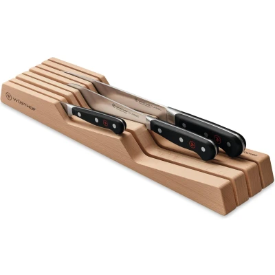 Vos couteaux Wustof préférés méritent non seulement une utilisation optimale, mais aussi une protection optimale. Grâce à ce tiroir en hêtre de haute qualité, vous pourrez ranger vos couteaux de manière ordonnée, sûre et peu encombrante, à l'abri des regards, mais toujours à portée de main. L'insert peut accueillir jusqu'à sept couteaux : trois grands jusqu'à 23 cm et quatre petits. Des fentes découpées avec précision maintiennent chaque couteau fermement en place, empêchant les lames de se toucher. Cela prévient l'usure, préserve le tranchant plus longtemps et permet de garder votre tiroir bien rangé. Fabriqué en bois de hêtre durable, cet insert de tiroir complète parfaitement la qualité de vos couteaux et l'esthétique d'une cuisine bien organisée. Caractéristiques et spécifications uniques * Capacité : Jusqu'à 7 couteaux – 3 grands (jusqu'à 23 cm) et 4 petits * Matériau : Bois de hêtre durable et robuste * Protection : Les fentes empêchent le contact et protègent la lame * Design : Compact et fonctionnel – s'intègre dans les tiroirs de cuisine standard * Facilité d'utilisation : les couteaux restent rangés proprement, en toute sécurité et à l'abri de la poussière * Finition : Bois naturel avec surface lisse * Pays d'origine : Allemagne Entretien et recommandations * Nettoyer avec un chiffon sec ou légèrement humide – ne pas immerger dans l’eau * Laisser sécher complètement après le nettoyage * Utiliser dans des tiroirs secs et bien ventilés pour conserver le bois en parfait état